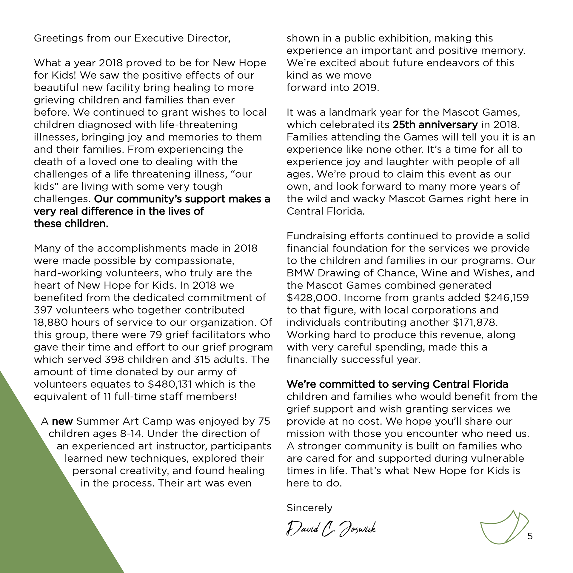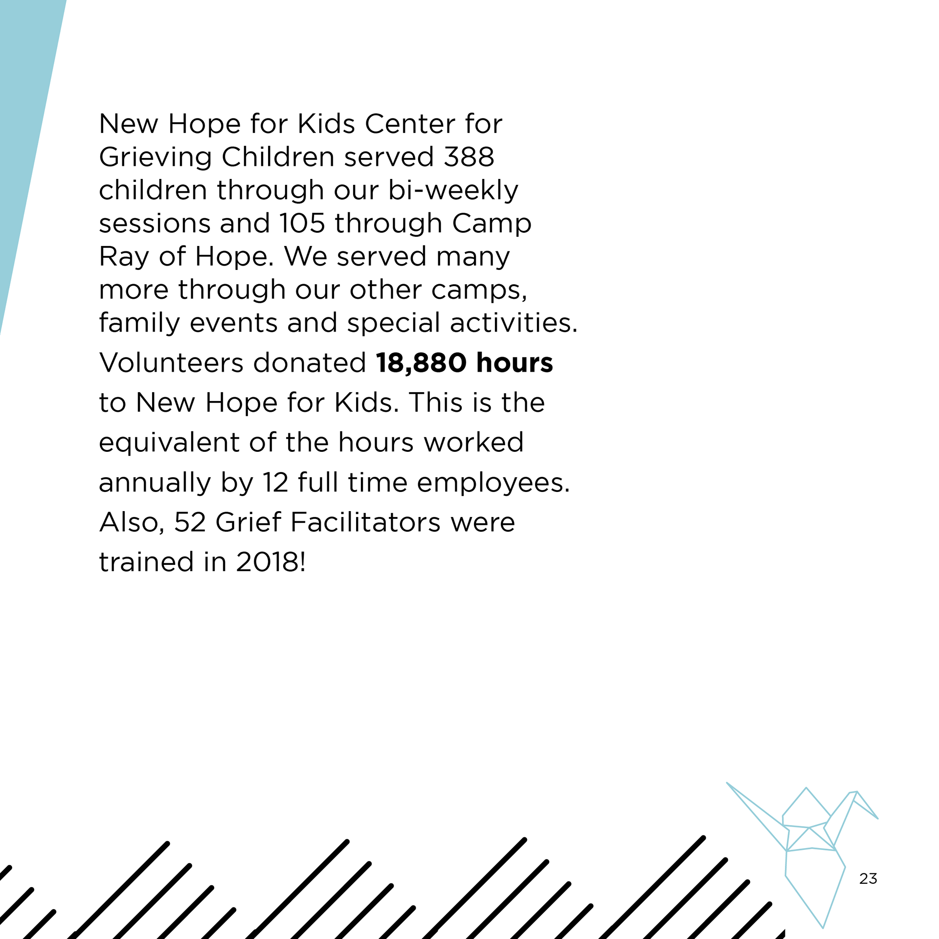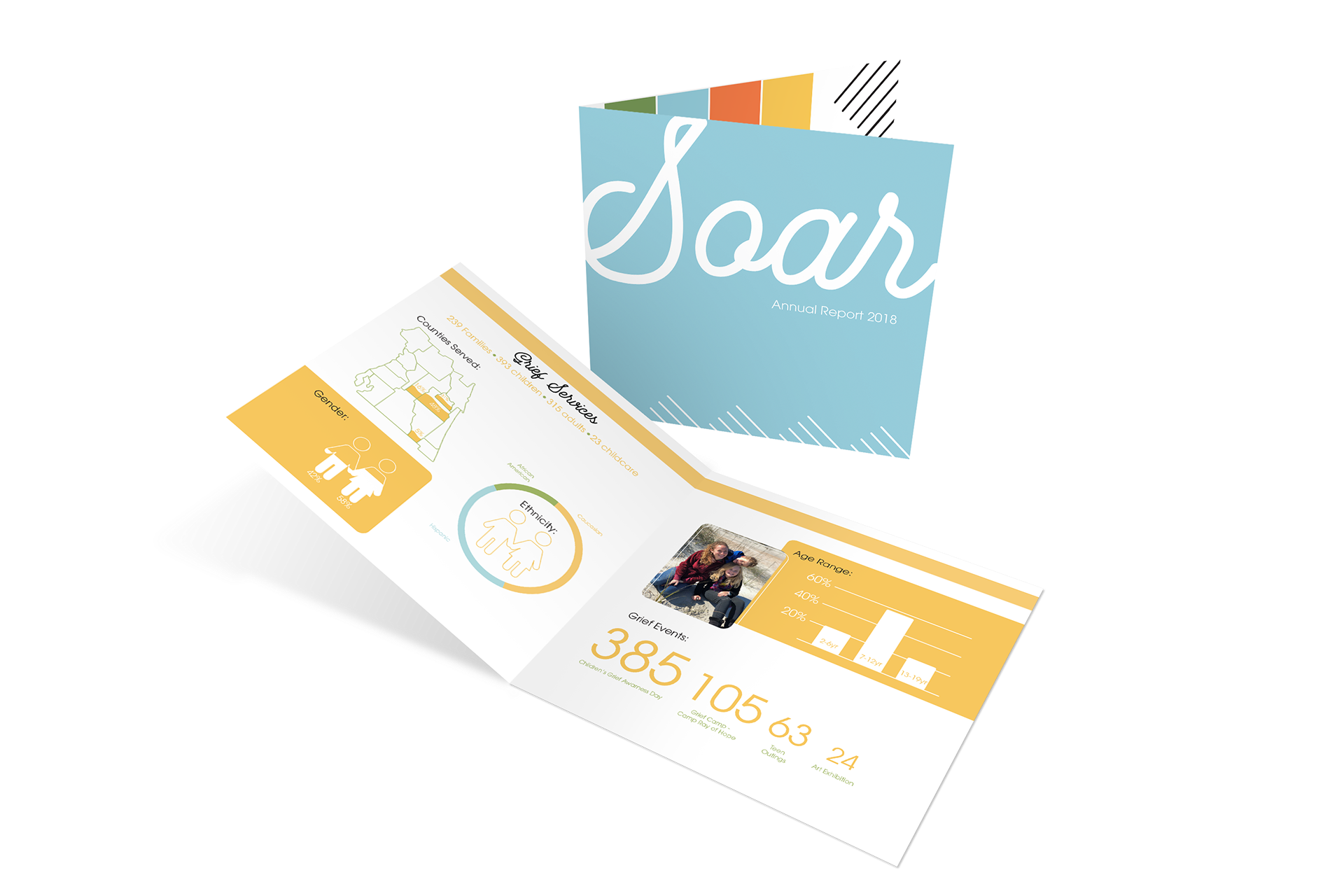 New Hope for Kids Annual Report is all about organizing information in a graphical and interesting to read way. The theme throughout is Soar. Uplifting and flying imagery unite the diverse information into a clear and encouraging read.